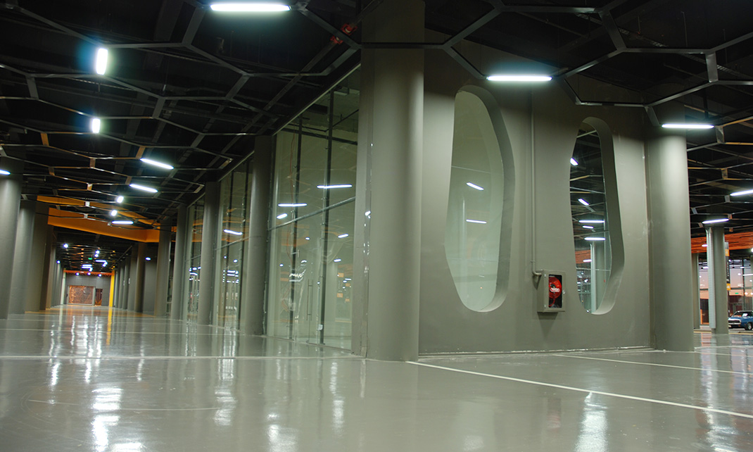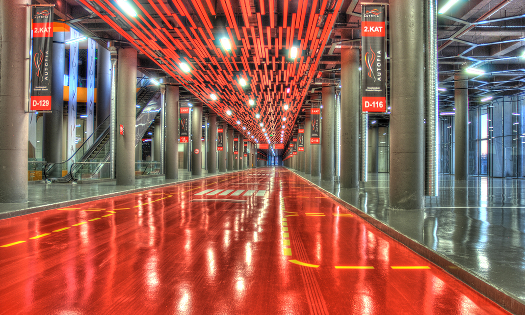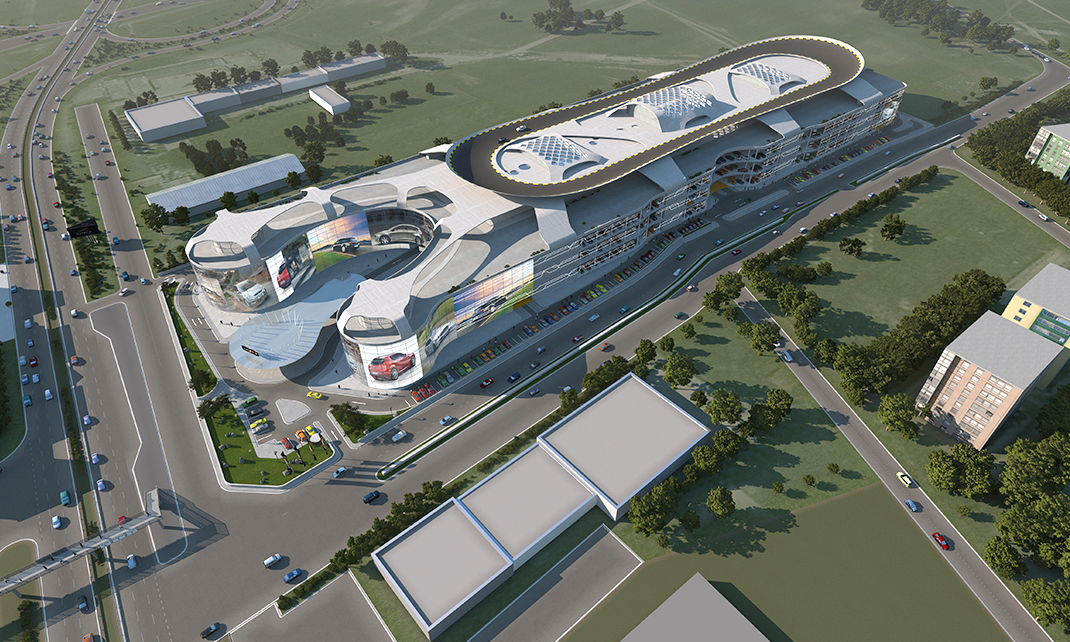 Yılı: 2011 | Yeri: Beylikdüzü/İSTANBUL | Özellikler: 180000 m2 - Çatıda %7 eğimli test sürüşü pisti mevcuttur, içerisinde her katta arabayla gezilebilen alışveriş merkezi, kat yüksekliği h=7m, her bir blok ebatları 110mx110m dir, 5 adet bloktan oluşmuştur.